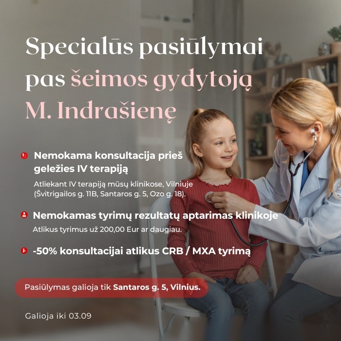 Nuosekli ir atsakinga sveikatos priežiūra prasideda nuo laiku atliktų tyrimų ir profesionalios gydytojo konsultacijos. Šiuo laikotarpiu kviečiame pasinaudoti specialiais pasiūlymais pas šeimos gydytoją M. Indrašienę, skirtais tiek ūminių simptomų įvertinimui, tiek išsamesniam sveikatos stebėjimui.